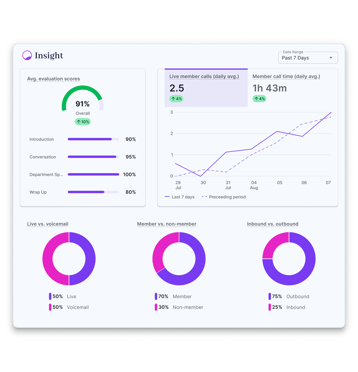 Evaluations and care manager activity drive real-time productivity and quality metrics at the team, individual, and call level.